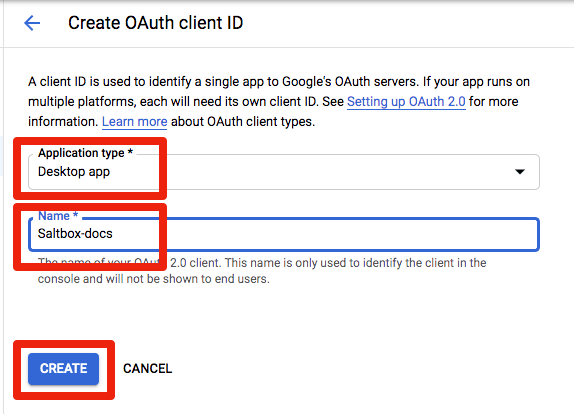 Choose "Desktop App", give the app a name, and click "CREATE":