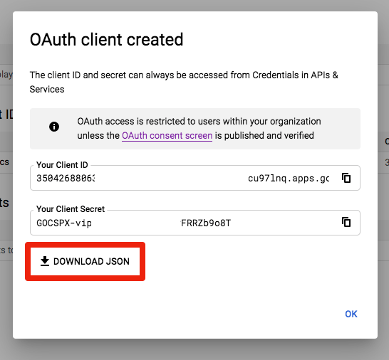 You'll be presented with the Client ID and Secret. Copy and save them somewhere; you may need them to configure other tools later. Click on "DOWNLOAD JSON" to download the credential file: